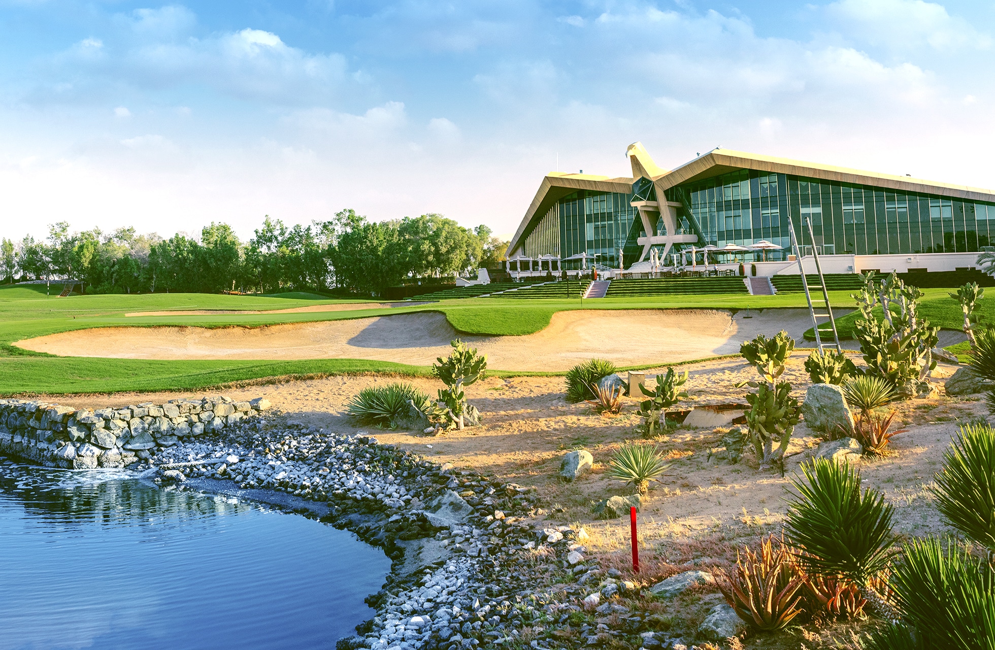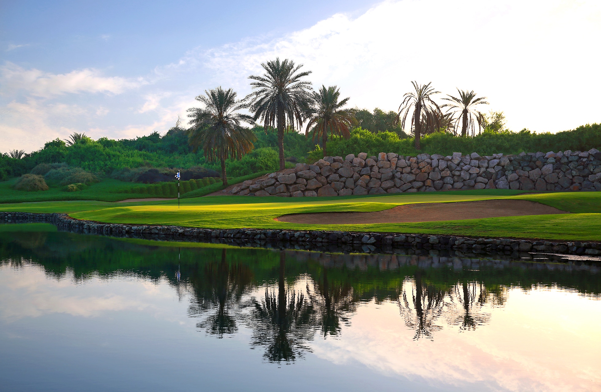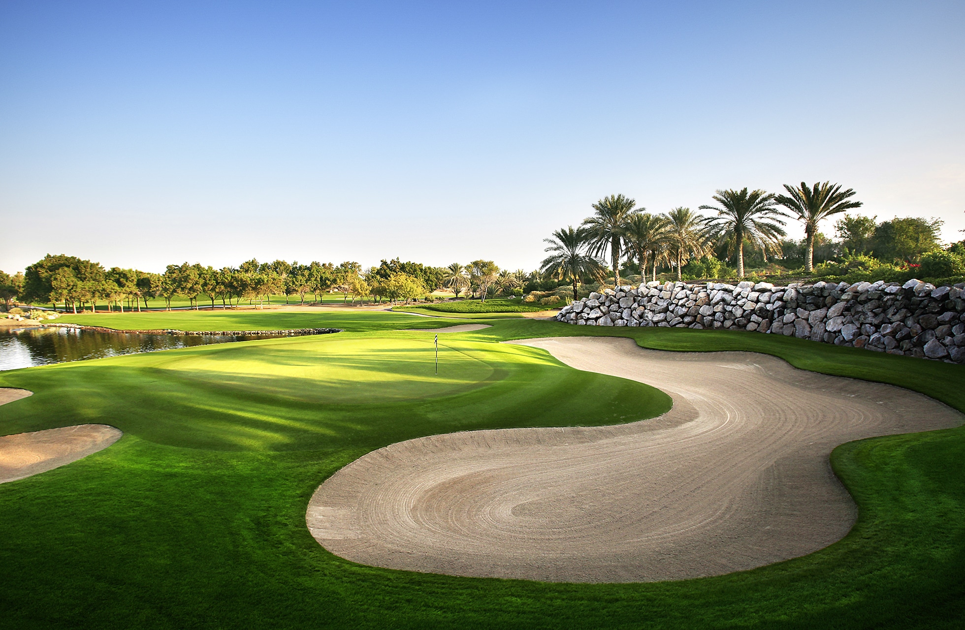 Men Abu Dhabi Golf Club er en populær bane, og mange af tour spillerne lovpriser Peter Harradines design, som nænsomt har udlagt denne fantastiske parkbane, med strategisk godt placerede vandhazarder og bunkers. I et tidligere ørkenlandskab, forventer man ikke, at der kan være mange vandhazarder, men her er ikke mindre end syv saltvandssøer.