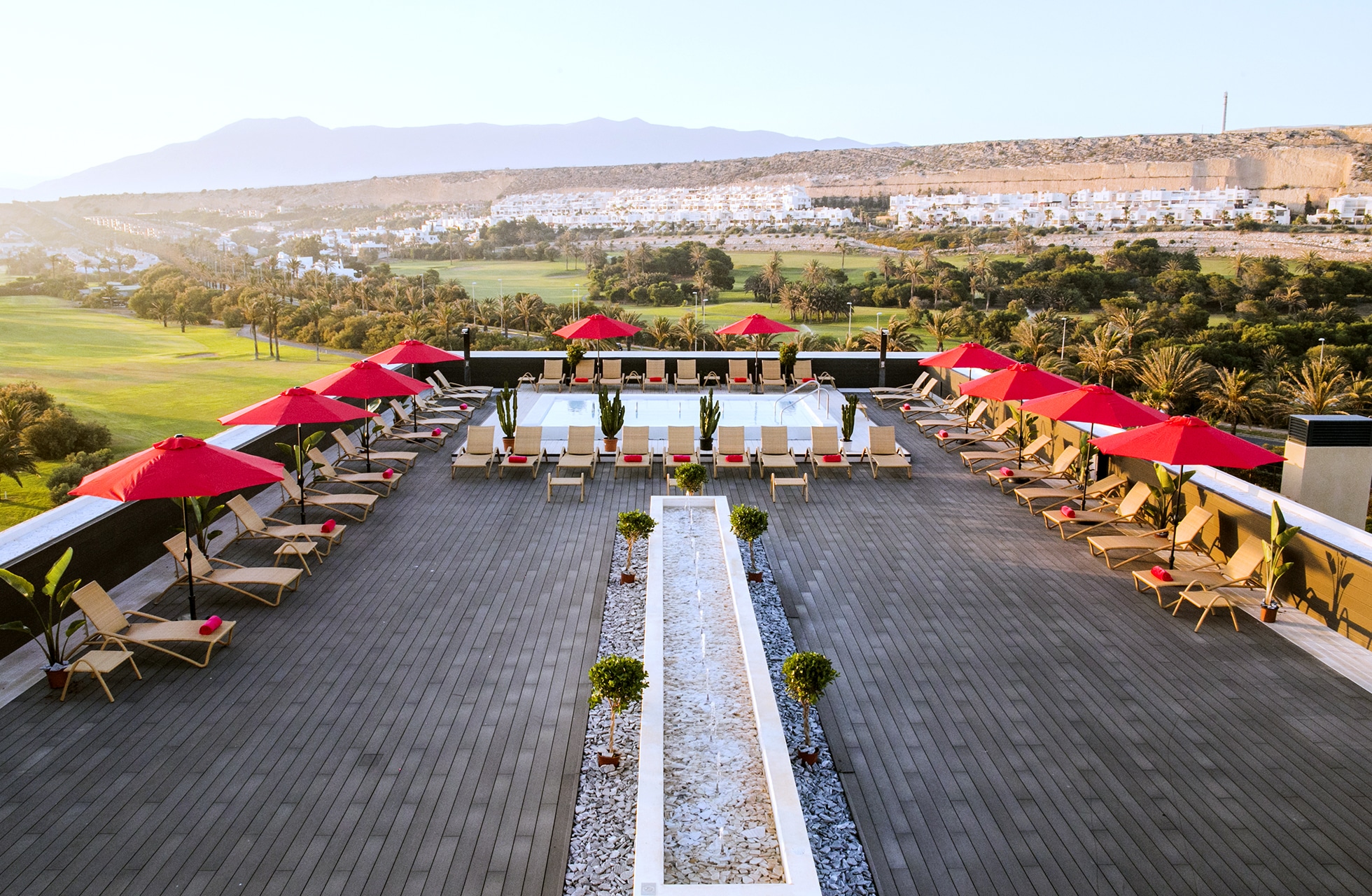 Almerimar Golf Hotel er det optimale sted at bo for dem, som vil holde en afslappende, men intensiv golfferie. Et moderne femstjernet hotel, perfekt placeret som nabo til klubhuset på den ene side, og marinaen på den anden side af gaden. Alle værelser har altan eller terrasse ud mod golfbanen. Værelserne er rummelige og moderne indrettede i lyse farver. Der er selvfølgelig en spaafdeling med pool, jacuzzi og sauna. På de gode eftermiddage, bør du gå op på tagterrassen. Her findes solsenge og en mindre udendørs swimmingpool. Den behagelige lobbybar er stedet, hvor dagens golfspil diskuteres. I restauranten serveres spanske specialiteter og internationale lækkerier. Når du rejser til Almerimar, så er vi sikre på, at du kommer til at værdsætte det afstressende miljø, den hyggelige bane, den gode mad og de herlige eftermiddage i solen. Kort sagt, her er det bare om, at nyde golf, sol og vand.