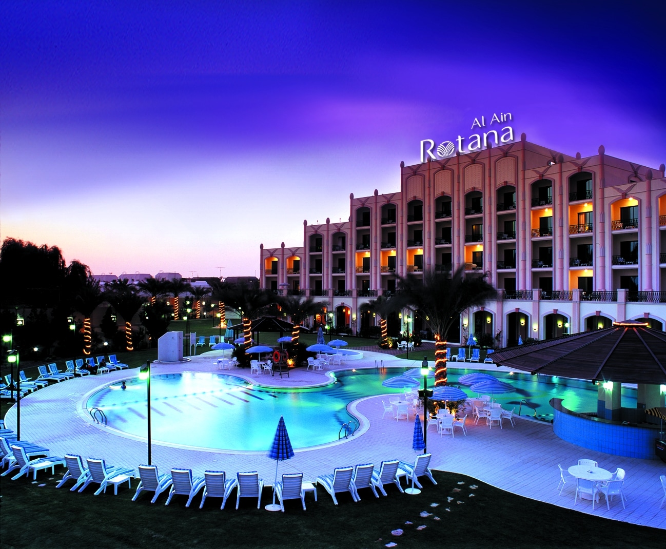 Rotana Al Ain er et femstjernet hotel centralt beliggende i Al Ain, og ca. 15 minutter fra golfbanen. Hotellet centrerer sig om det fantastiske poolområde, som har en hyggelig poolbar. Man spiser godt og varieret på hotellet og Trader Vic pubben byder ofte på livemusik.